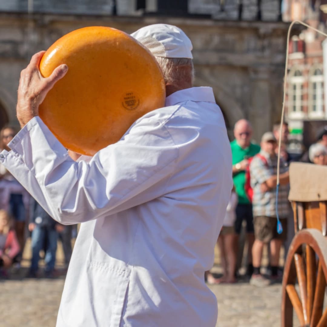 Cheese carriers: The cheese carriers, dressed in traditional white outfits and straw hats, transport large wheels of cheese on wooden barrows. Their synchronized movements and rhythmic steps are a sight to behold and an integral part of the marketâs charm.